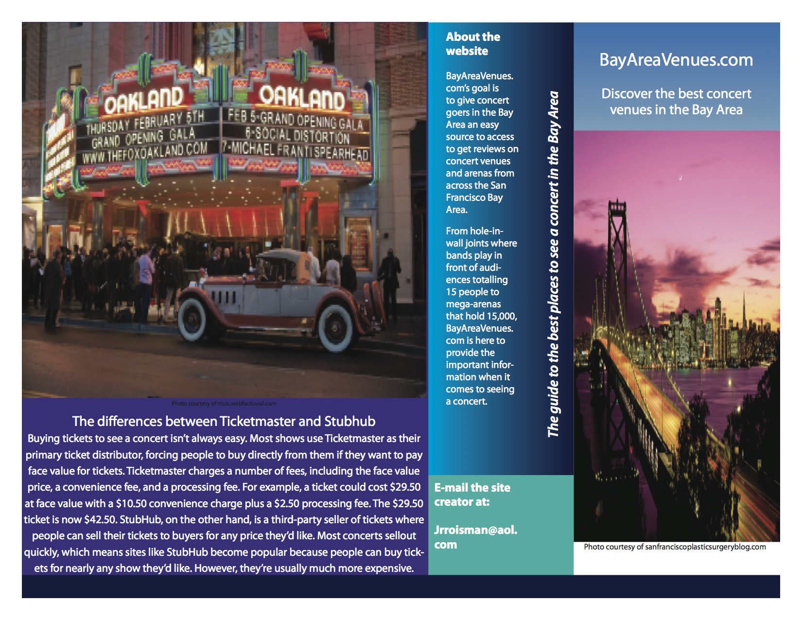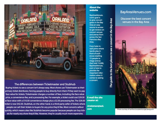 The PDF file attached to this page is a brochure I made using Adobe InDesign in class. It shows graphics and text regarding the best music venues in the Bay Area.