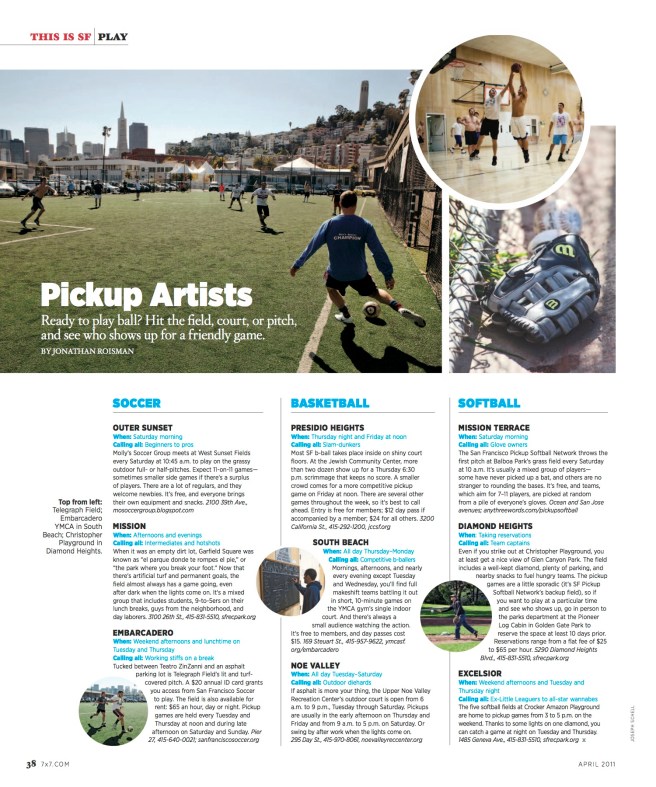 This is a feature article I wrote for 7×7 Magazine about the different recreational pickup games in San Francisco. Click the PDF file below to view the story.